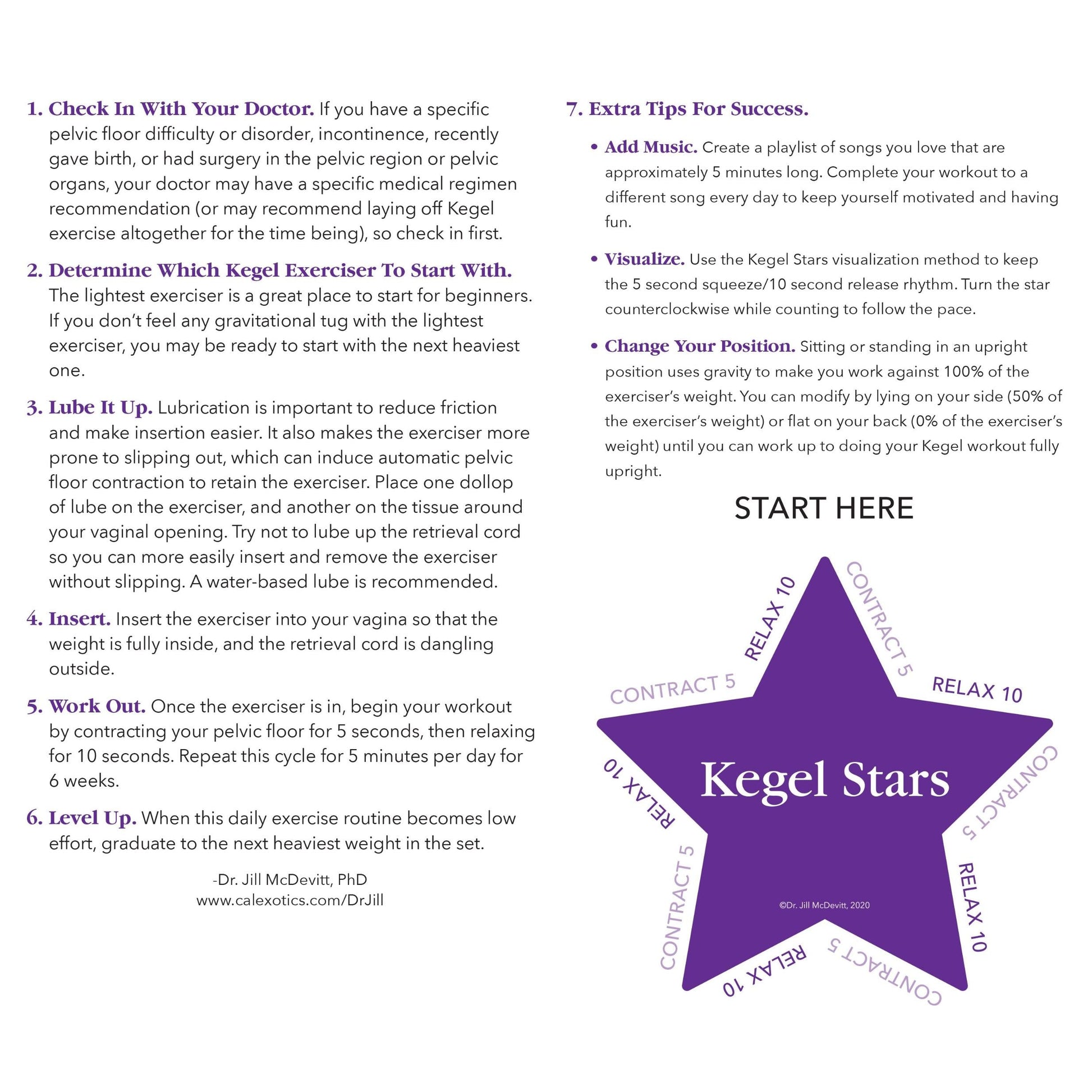 Juego de entrenamiento Kegel de 5 piezas de California Exotic Novelties. Apriete y tonifique los músculos del suelo pélvico en sólo 5 minutos al día con el juego de 5 piezas de entrenamiento Kegel de Cal Exotics. Dale a tus músculos del suelo pélvico el entrenamiento que anhelan con 5 ejercitadores con peso gradual para aumentar suavemente la intensidad del ejercicio y el placer sexual. El juego de 5 piezas incluye 40 g, 60 g, 80 g, 100 gy 120 ge o aproximadamente 1,41 onzas, 211 onzas, 2,82 onzas, 3,52 onzas, 4,23 onzas y una rutina de ejercicios completa. Si bien las pesas dobles funcionan para aumentar la excitación sexual, están diseñadas para tonificar y fortalecer suavemente los músculos pélvicos. Al trabajar esos músculos clave del amor, se reduce el riesgo de trastornos del suelo pélvico o incontinencia, al tiempo que se aumenta el placer erótico. Un cable de recuperación extendido hace que la extracción sea rápida, fácil y suave. Las pesas Kegel están hechas de silicona higiénicamente superior. Este material seguro para el cuerpo no tiene perfume ni ftalatos para mantener los puntos más sensibles felices y saludables.