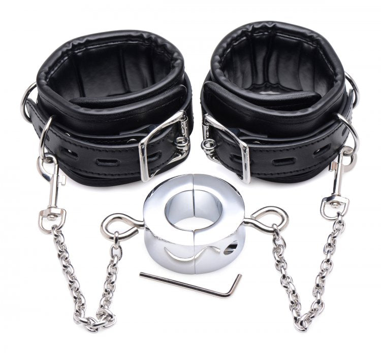 Master Series Hell's Tether Ball Stretcher Humbler de XR Brands. ¡Hells Tether combina dos formas tortuosas de jugar con tu saco de submarinos! La pesada camilla de bolas agrega un peso sustancial al monedero de su amante y se puede convertir en un Humbler con las tobilleras incluidas, use la llave Allen incluida para asegurar este anillo pesado al Ball Sack de su pareja y coloque las tobilleras incluidas. ¡Para obligarlos a arrodillarse donde pertenecen! Los puños de los tobillos se pueden ajustar para encontrar el ajuste perfecto y cuentan con tres puntos de fijación con anilla en D para sujetar las restricciones que elijas y bloquearlas aún más. Los puños de los tobillos cuentan con hebillas de bloqueo si eliges agregar tu candado favorito a la combinación. El Ball Stretcher Ring cuenta con puntos de fijación adicionales para más pesos o más restricciones. ¡Experimente con su amante y vea hasta dónde puede estirar sus límites! Pesado, duradero y perfecto para mazmorras de dormitorio, ¡cumple tu fantasía de humillaciones e intercambio de poder con esta adición de heavy metal a tu colección! Los puños acolchados en los tobillos garantizan comodidad durante toda la escena y son fáciles de desinfectar después de la escena. Medidas: Los puños del tobillo se ajustan de 8,5 pulgadas a 13 pulgadas de circunferencia. Diámetro interior del ensanchador de bolas: 1,25 pulgadas, altura: 1 pulgada, grosor: 0,5 pulgadas. Peso a granel 12 onzas. Longitud de las cadenas 9 pulgadas. Materiales: Poliuretano PU Cuero y Metal. Colores: Negro, Plata. Categorías: Bondage, Fetiches, Torceduras, Esposas, Restricciones Bondage, Equipo para pene y pelotas para hombres. 2023.