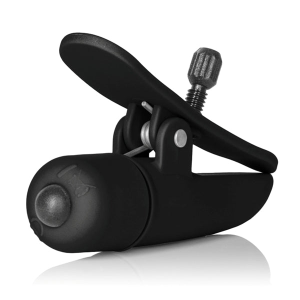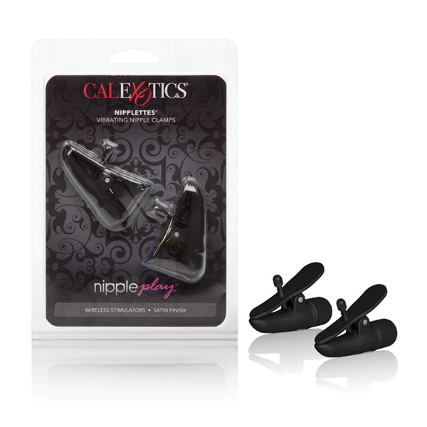 Nipplettes de juego de pezones negros. Incluye 2 abrazaderas de diseño totalmente ajustables y multiusos. Motor inalámbrico de alta intensidad con fácil control mediante botón. Resistente al agua para usar en todas partes. Acabado satinado suave y sedoso. Seguro y puro para el cuerpo y el placer, fabricado con materiales libres de ftalatos, plástico ABS con abrazaderas para pezones de poliuretano PU Cote, botones de elastómeros termoplásticos TPE y tornillos de nailon. 2,75 pulgadas de largo. Las pinzas vibratorias requieren 6 pilas de reloj. 12 incluidos. Peso a granel 1 onza.