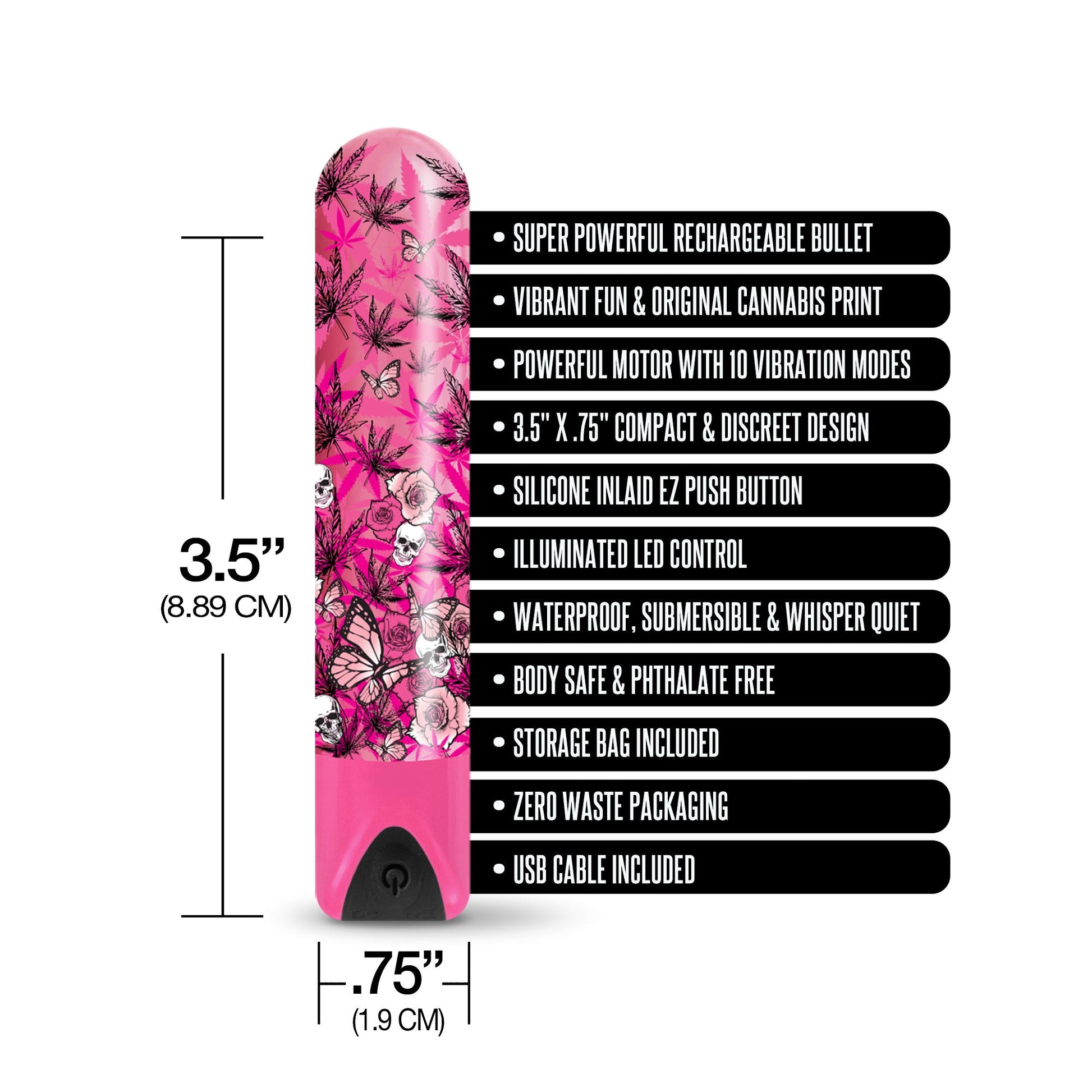 Imprime el encantador vibrador de belleza Blazing Bullet recargable de mayor potencia Buzzed de Global Novelties. Bala recargable súper potente con un divertido estampado de cannabis original y vibrante. Potente motor con 10 modos de vibración. Diseño compacto y discreto de 3,5 x 0,5 pulgadas. Pulsador fácil con incrustaciones de silicona y control LED iluminado. Resistente al agua, sumergible y silencioso, seguro para el cuerpo y libre de ftalatos. Bolsa de almacenamiento incluida, embalaje sin desperdicio y cable USB incluido. Fabricado con materiales seguros para el cuerpo y libres de ftalatos. Eje de plástico ABS, botón pulsador de silicona. Categorías: Vibradores Clásicos, Vibradores Recargables, Balas y Huevos Vibradores, Vibradores Novedosos. 2023.