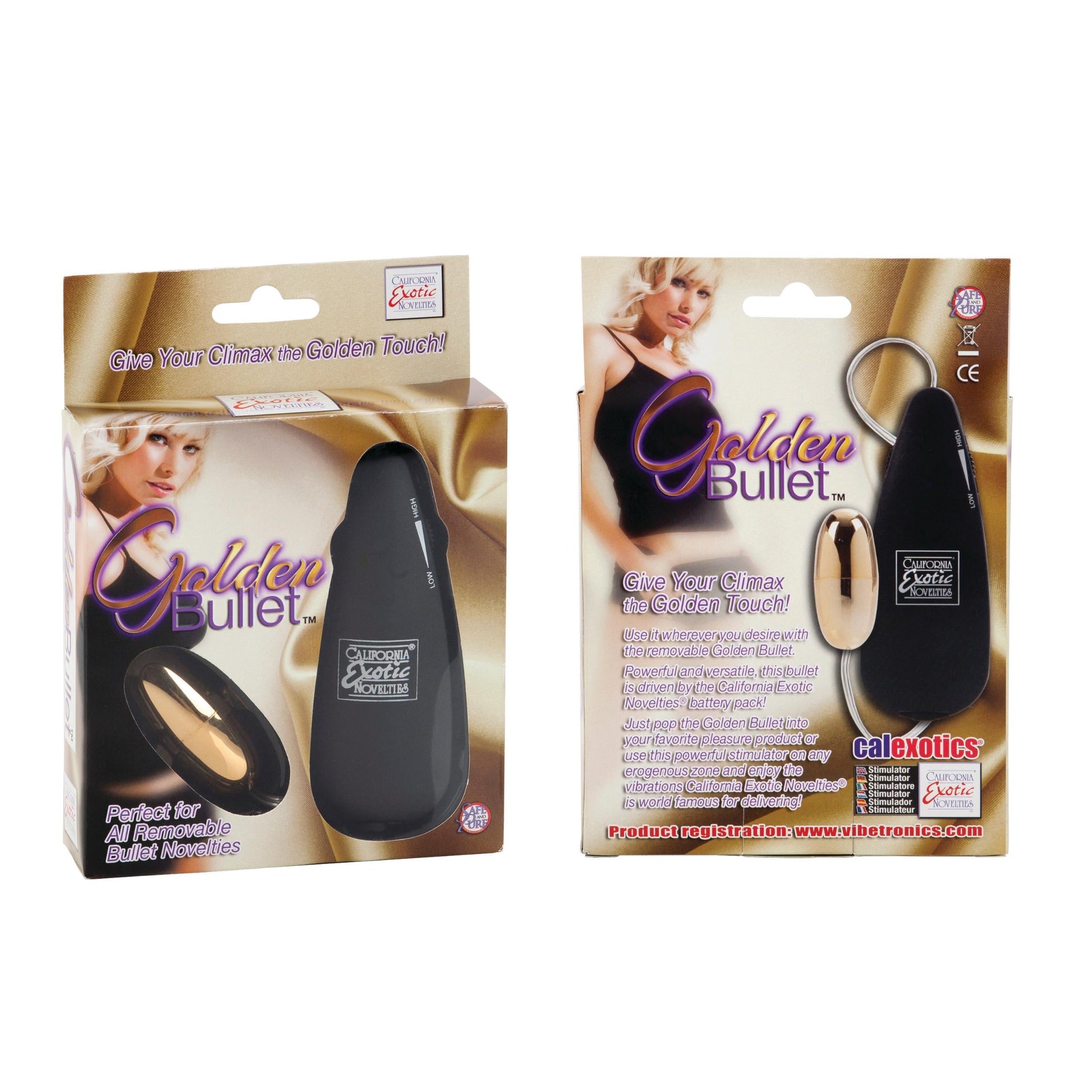 Give your climax the Golden touch! Use it wherever you desire with the removable Golden Bullet. Put in in your favorite pleasure device or use on your favorite erogenous zone and enjoy the vibrations only Swedish Erotica can deliver. Customize your erotic toys or excite yourself with the versatile Golden Bullet and its powerful battery pack. Vibrator warning this bullet is highly explosive. You'll be amazed at the power contained within the compact bullet vibrator. It may be teeny, tiny, but this versatile personal massager provides sexual stimulation that's guaranteed to get you off. Use it alone or with removable bullet adult novelties. Attached remote holds batteries and controls speed. Powerful amazingly quiet discreet mini bullet with multiple speed power pack. Vibrating sex toy requires 2 AAA batteries, not included. Do not leave batteries in the vibrator between uses. Safe and pure for body and pleasure. Made using phthalate free, non-toxic materials ABS plastic power controller. ABS plastic with gold plating. Bullet vibrator measures 2.2 inches long by 1 inch wide. Bulk weight: 2.2 ounces. Always clean before and after use. Category: For Women, Bullet, Beads & Balls, Bullets, Top Selling Sex Toys. Golden Bullet Vibrator is a registered trademark for California Exotic Novelties. Sex toys and sexual wellness. New high resolution images added.